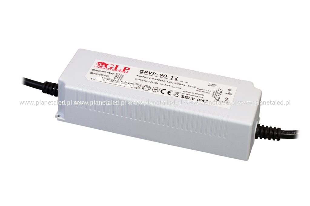 GLP PSU: 12V/7.5A, CV, PFC, IP67, plastic case, double insulation wires