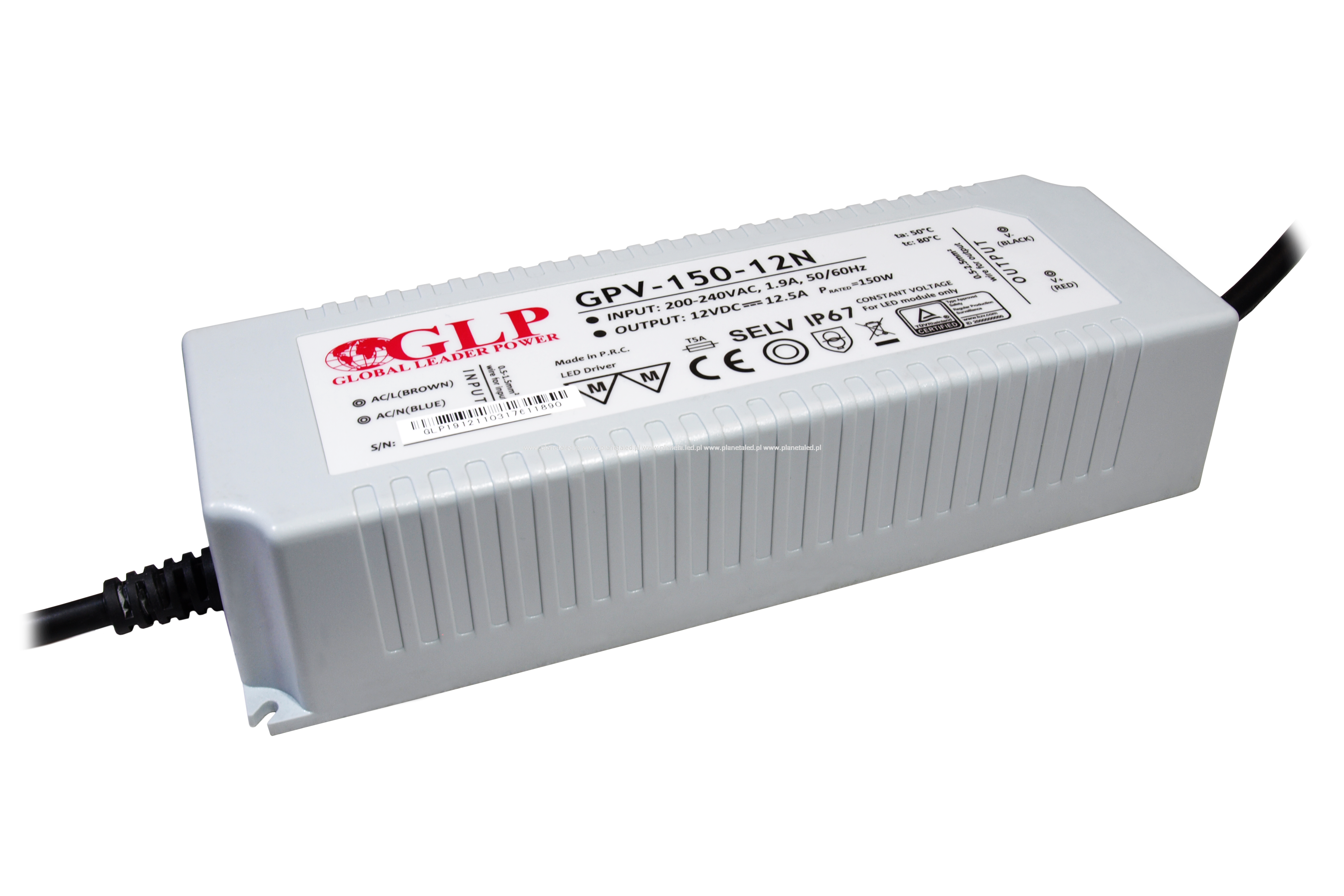LED power supply GLP GPV series 12V/12.5A, CV, non-PFC, IP67 plastic case