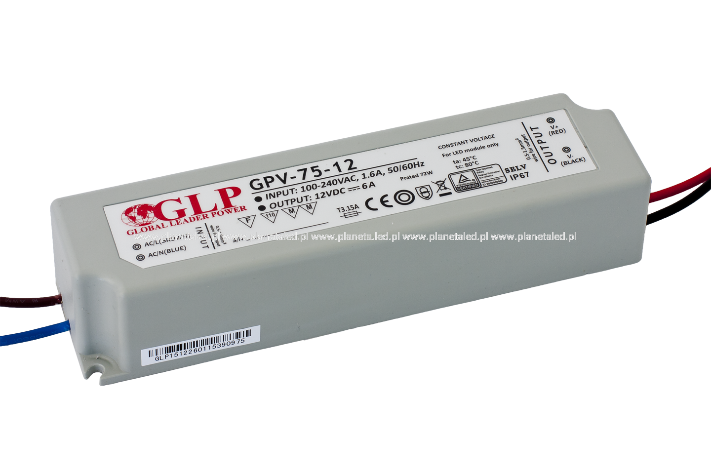 LED power supply GLP GPV series 12V/6A, CV, non-PFC, IP67 plastic case