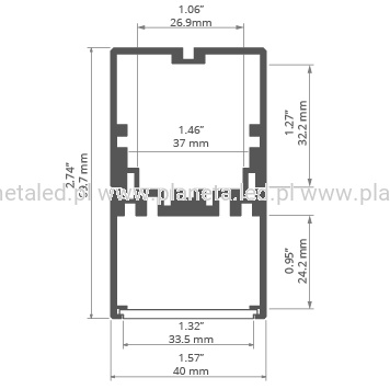 Wysoki profil pełniący funkcję listwy montażowej ma możliwość pomieszczenia zasilacza (max.: 32mm x 26mm). Służy również do prowadzenia przewodów zasilających.