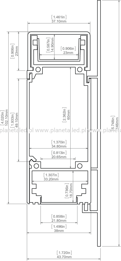 - miejsce na pasek LED: góra - 23 mm, dół - 33.2 mm