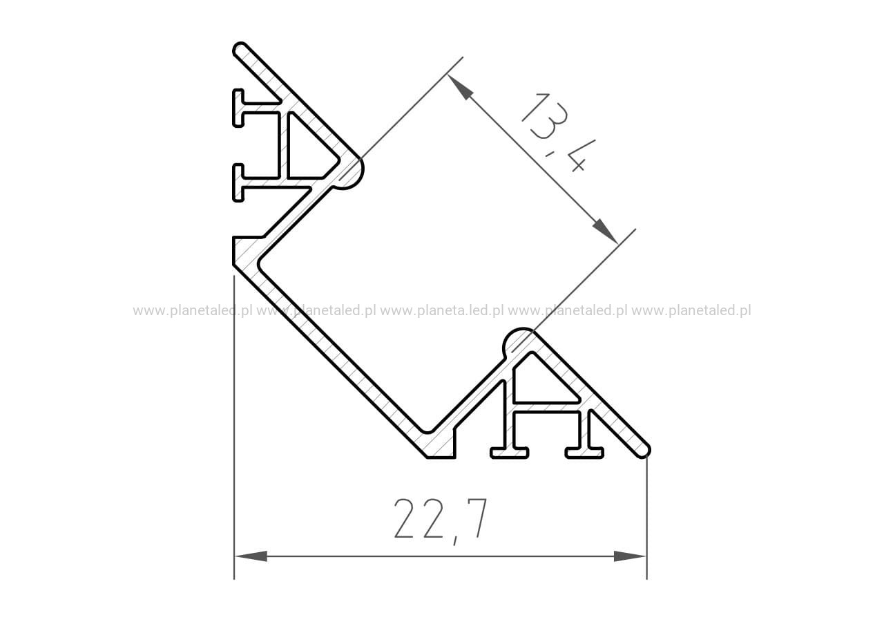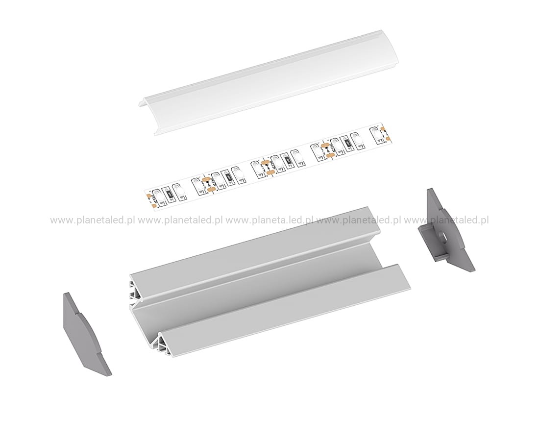 Profil P7-1 jest profilem narożnym o kącie kierowania światła równym 45 stopni. Najczęściej stosowany w narożnikach mebli lub ścian. Dzięki ściętemu tyłowi, może zamaskować nierówności narożników.