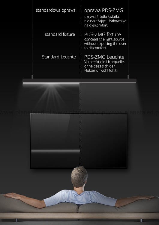 Ukryte źródło światła w oprawie zapewnia wyższy komfort przebywania we wnętrzach z dużą ilością opraw oświetleniowych. Zagłębione źródło światła w profilu PDS-ZMG utrudnia kontakt wzrokowy z najjaśniejszym elementem oprawy.