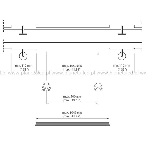 - maksymalna długość jednego odcinka profilu POR wraz z zaślepkami to 1049 mm
