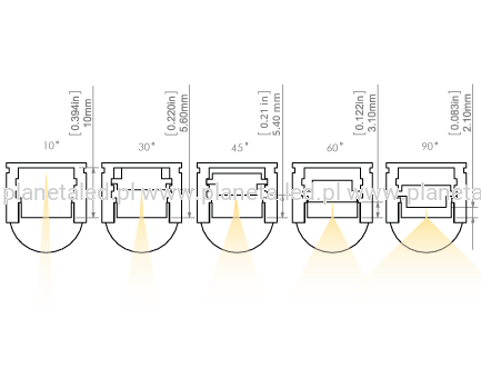 - regulacja ustawienia wkładki umożliwia osiągnięcie kątów rozsyłu 10, 30, 45, 60 i 90 stopni