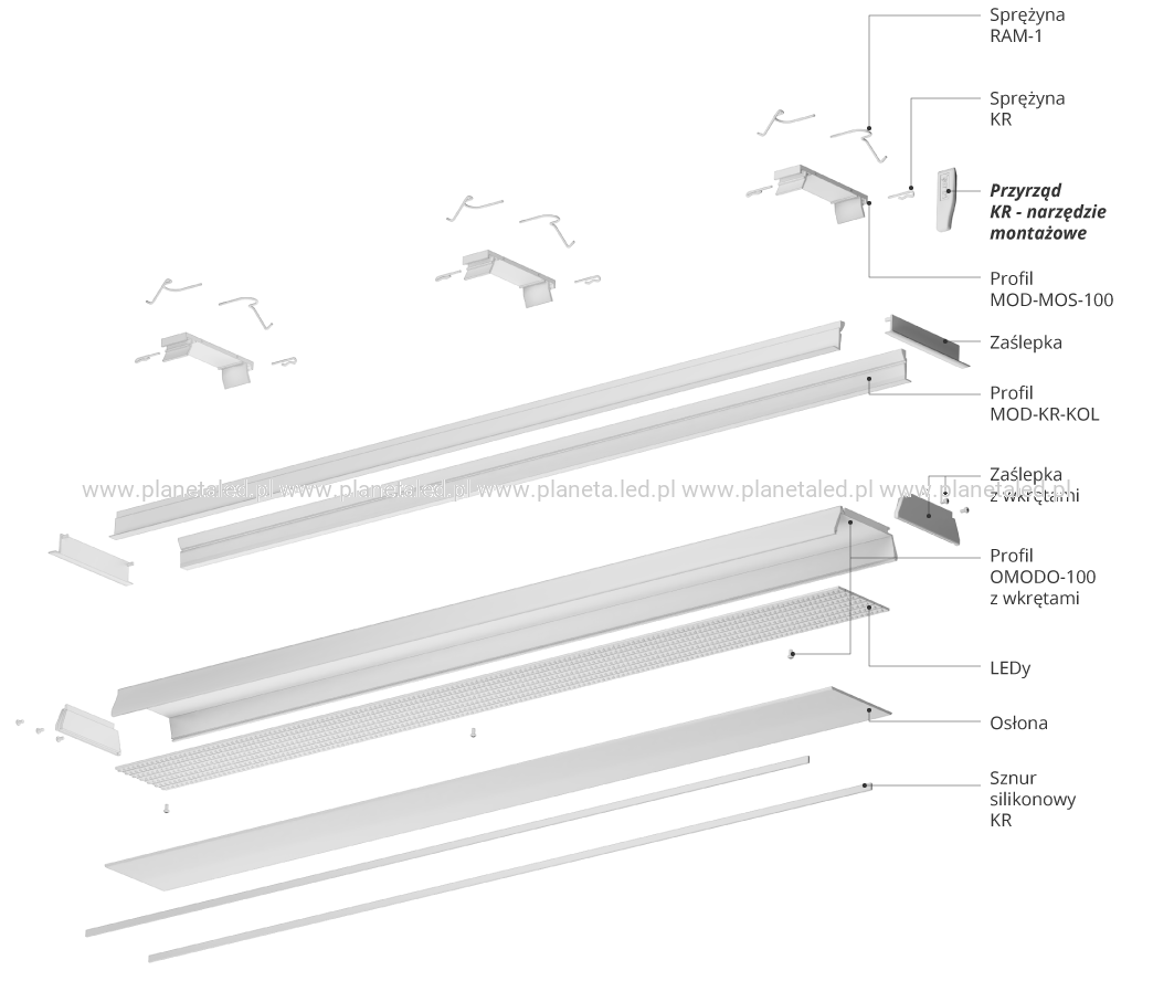 Oprawa opracowana jest tak, że „rdzeń” oprawy (profil z taśmami LED, zasilaczem, przewodami i zaślepkami) w całości można przygotować wcześniej, w warunkach fabrycznych. W miejscu przeznaczenia montaż ogranicza się do wpięcia gotowego (uzbrojonego) „rdzenia” (OMODO-100) we wcześniej zamontowany kanał montażowy (RAM-KOL-100).