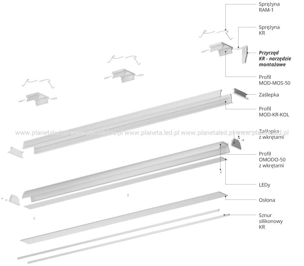 - montaż „rdzenia” oprawy (OMODO-50) w „kanał montażowy” (RAM-KOL-50) za pomocą zaczepów blokowanych wkrętami.