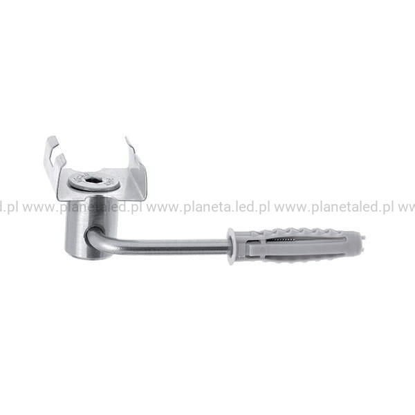 Gotowy zestaw elementów do zamocowania na ścianie murowanej lekkiej oprawy oświetleniowej. Zawieszka wyposażona jest w MOCOWNIK PDS. Zapewnia też możliwość regulacji kąta, pod jakim zamocowana jest oprawa. Do ściany przytwierdzona jest na PRĘCIE FI-3 , zakończonym kołkiem rozporowym.